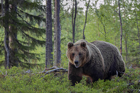 Because bears are close and the surrounding is quieter than in the swamp areas, the sounds of the bears can be heard more easily. Wolverine also move in the forest area and can be photographed near the hides.