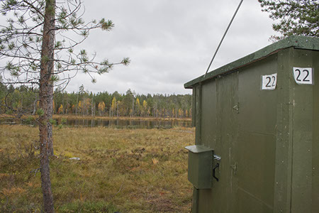 Hide 21 is located near a small round pond, on its left corner. This hide has been set back approximately 20 meters from the waterfront, bears can pass between the hide and water in clear view. Bears can also walk around the pond near waterfront. From this hide it is possible to photograph bear and wolverine in front of pond, opposite bank and next to the pond. Hide 21 is good for photographing to the swamp on the left side of pond.