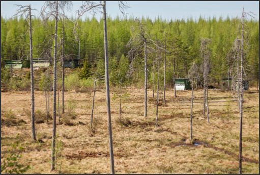 Approximately 30m away to the right hand side, there is thick forest cover where the bears can sometimes emerge from. The ground cover between the hide and the trees is wetland, with sages and various vegetation.